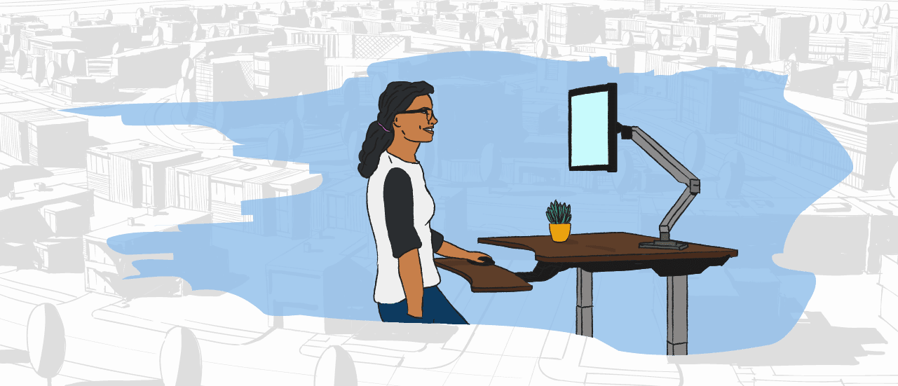 - She now works in an upstairs room. There’s a new standing desk, a properly adjustable office chair and storage for documents.